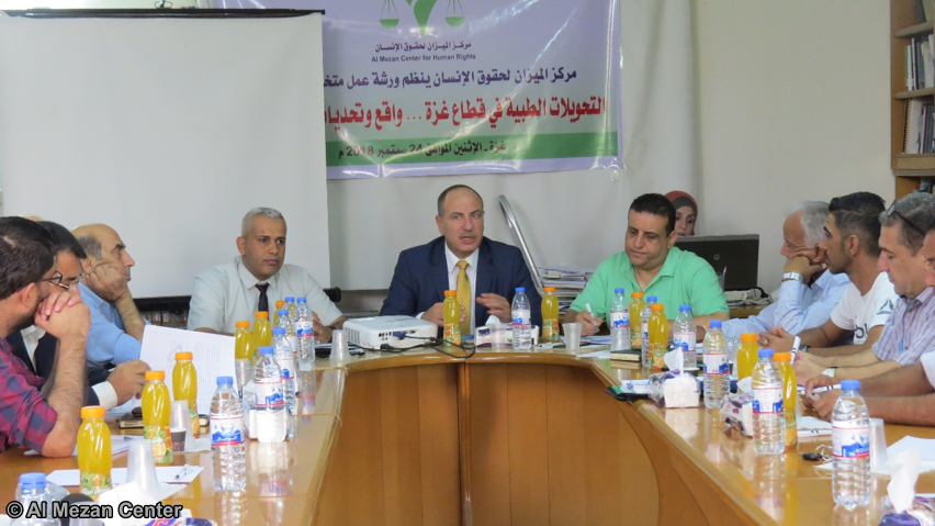 نظم مركز الميزان لحقوق الإنسان ورشة عمل متخصصة حول التحويلات الطبية في قطاع غزة تحت عنوان: الواقع والتحديات وسبل المعالجة، في قاعة المكتبة بمقر المركز الرئيس في مدينة غزة، يوم الإثنين الموافق 24/09/2018م، بمشاركة (18) مسؤولاً وممثلاً عن وزارة الصحة الفلسطينية ودائرة العلاج بالخارج، ومؤسسات صحية دولية ومحلية.