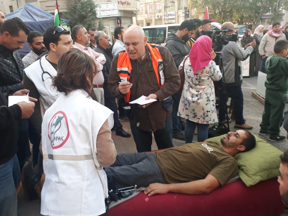 نظم أعضاء مجلس منظمات حقوق الإنسان الفلسطينية والهيئة المستقلة لحقوق الإنسان ولجان العمل الصحي يوم أمس الأول السبت الموافق 16/11/2019، زيارة تضامنية مع الأسرى المحررين المقطوعة رواتبهم من قبل وزارة المالية منذ العام 2013، والمعتصمين على دوار الشهيد ياسر عرفات.
