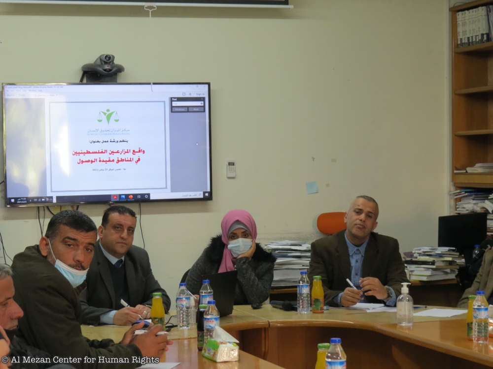 نظم مركز الميزان لحقوق الإنسان، في مقره بمدينة غزة، يوم الخميس الموافق 25/02/2021م، ورشة عمل متخصصة حول: واقع المزارعين الفلسطينيين في المناطق مقيدة الوصول، بمشاركة ممثلين عن وزارة الزراعة ومؤسسات دولية ومؤسسات المجتمع المدني الناشطة في مجال الزراعة والتنمية في قطاع غزة.