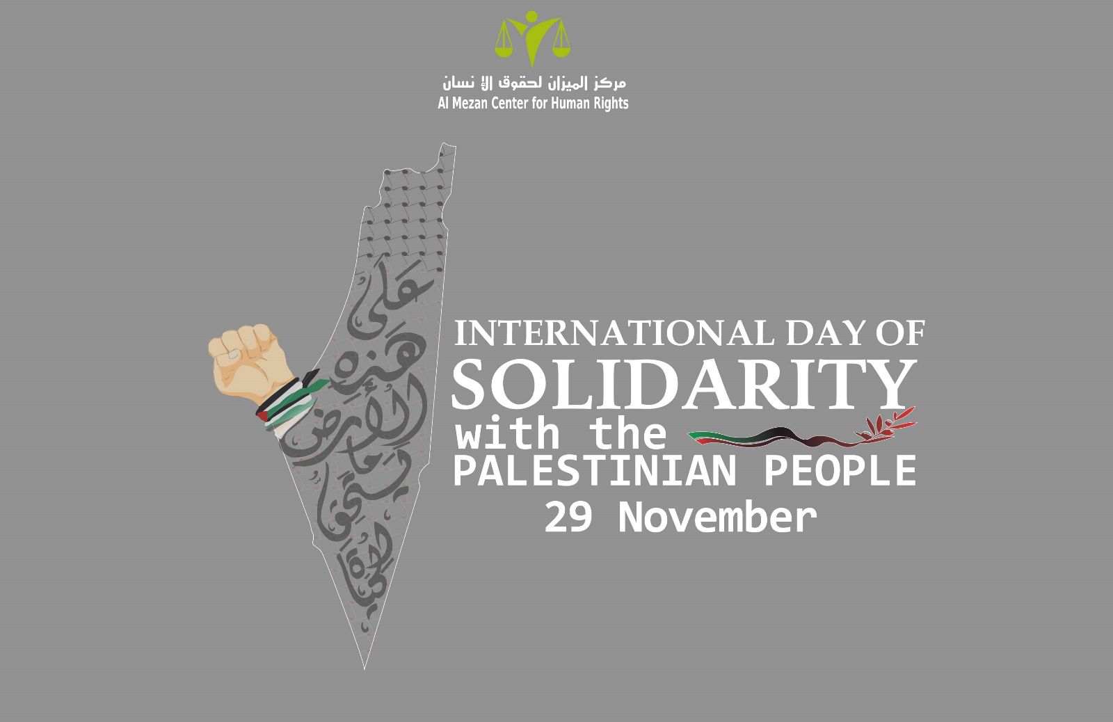 29 November marks the International Day of Solidarity with the Palestinian People, declared by the United Nations (UN) General Assembly in 1977 under Resolution 32/40 B. Forty-five years on, Israeli forces continue to oppress the Palestinian people and escalate their heinous crimes and violations against them—including willful killings, forcible transfers, home demolitions, ethnic cleansing ,arbitrary detention campaigns, administrative detention policy against detainees, and the expansion of the illegal settlement enterprise. Israel has also controlled the land and natural resources of the Palestinian people for more than 74 years. It denies Palestinians their right to self-determination and independence and prevents them from pursuing their economic and social growth and living with dignity and prosperity.