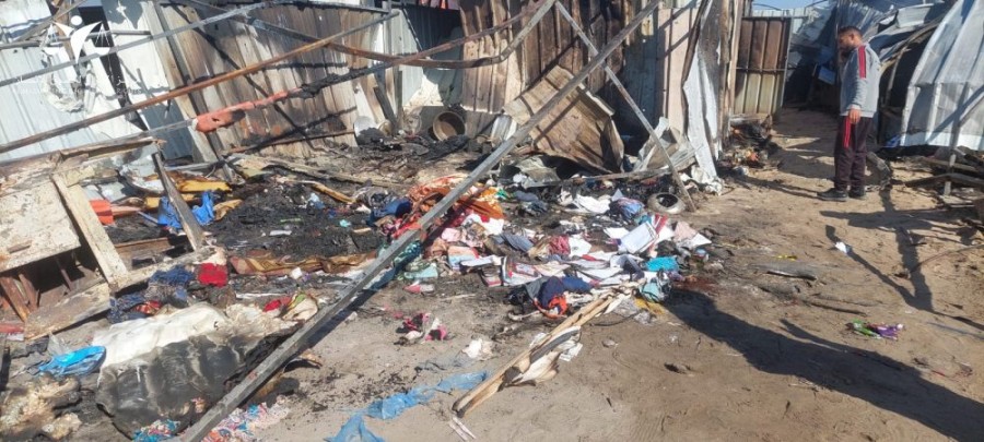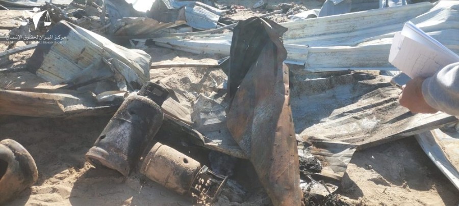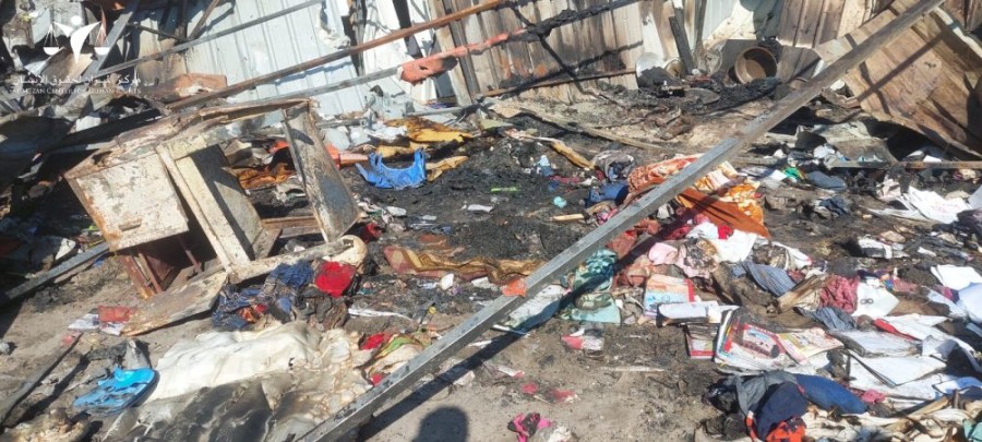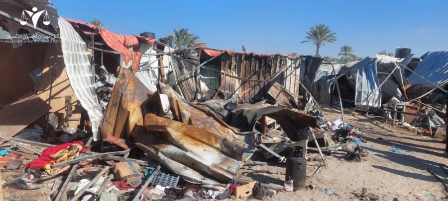 At around 4:50 pm on Wednesday, 4 December 2024, Israeli warplanes targeted two makeshift tent camps sheltering internally displaced persons (IDPs) in the Al-Mawasi area of Khan Younis City with four missiles. The targeted IDP camps are the “Al-Salam Camp” on Street 5, which shelters over 20 tents, and the “Al-Mohibbin Camp” on Al-Astal Street, hosting more than 150 tents. The two camps are approximately 150 meters apart. This area is one of the most densely populated by displaced families, who have endured multiple waves of displacement. Thousands of individuals have sought refuge there. The attack killed 22 Palestinians, including eight children and three women, and injured 18 others. Several tents were destroyed, and many more sustained severe damage from flying debris and shrapnel.