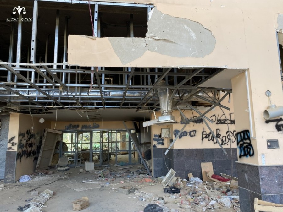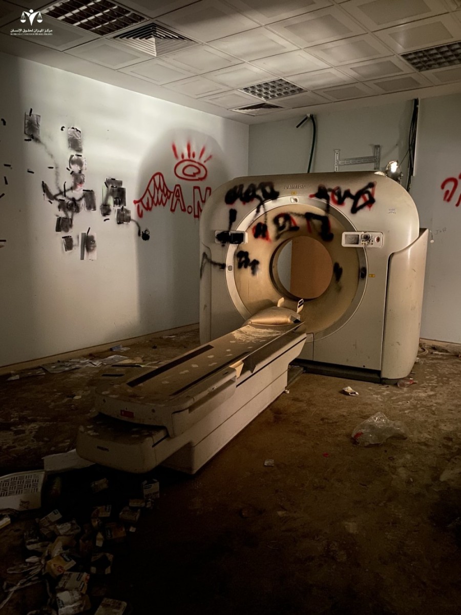 During a field visit to the hospital facility on 1 February 2025, Al Mezan’s team witnessed and documented the extensive devastation. Basem Abu Jray, a researcher at Al Mezan, described the scene: “Smoke was still rising from some sections, and the smell of burning lingered in areas we could not access. Walls and ceilings were blackened by fire, and specialized medical equipment, hospital beds, and entire sections—particularly the pharmacy—were completely burned. Israeli soldiers inscribed slogans, words, and symbols on the walls of hospital departments, patient rooms, and medical equipment. In some areas, piles of garbage covered parts of the building.”