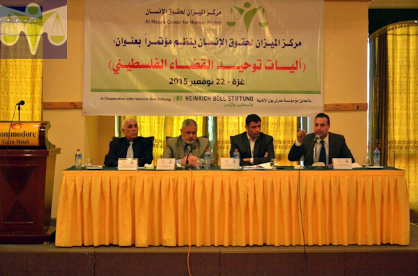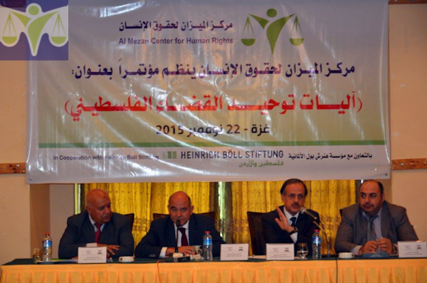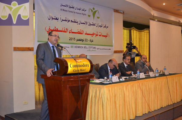 نظم مركز الميزان لحقوق الإنسان اليوم الأحد الموافق 22/11/2015، مؤتمراً تحت عنوان " آليات توحيد القضاء الفلسطيني" في قاعة فندق الكومودور في مدينة غزة، بحث المؤتمر في آليات ممكنة جديدة وواقعية لتوحيد الجسم القضائي الفلسطيني، بما يضمن استقلال القضاء وينعكس ايجاباً على تحقيق العدالة للمواطنين وضمان استقرار المجتمع، وقد شهد المؤتمر حضوراً مكثفاً لممثلي أحزاب سياسية ومؤسسات أهلية وحقوقيين وأكاديميين ومهتمين.