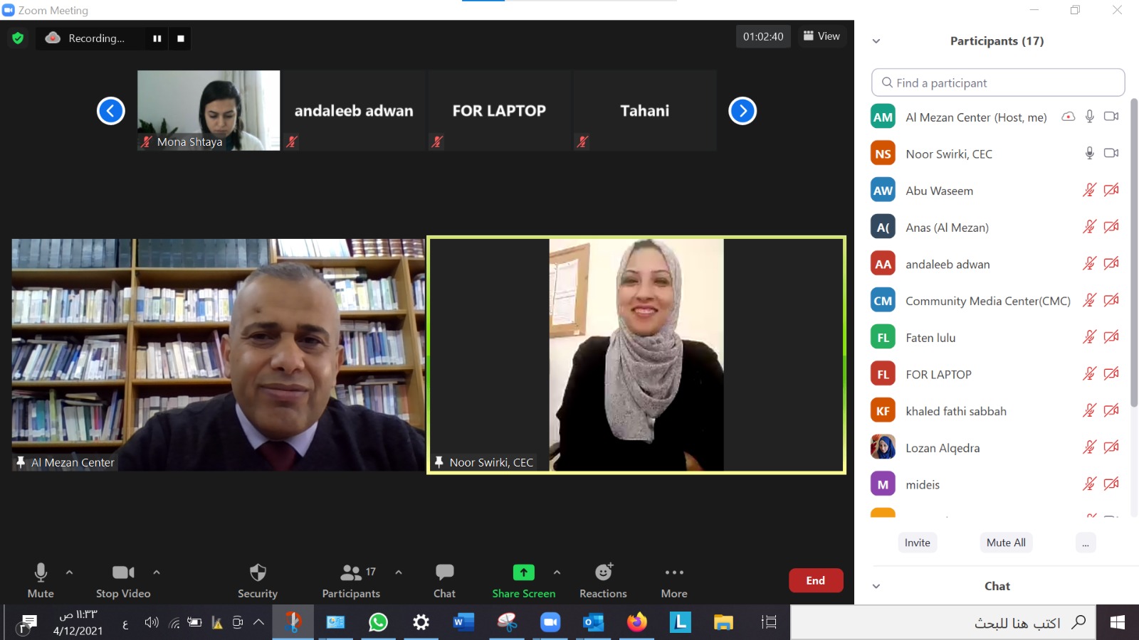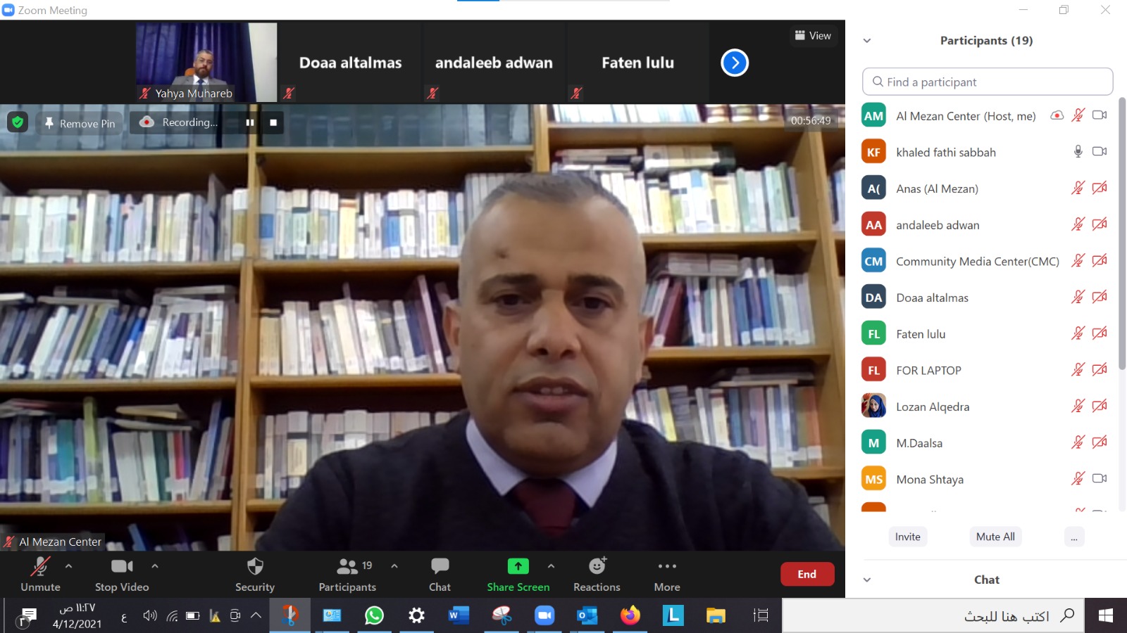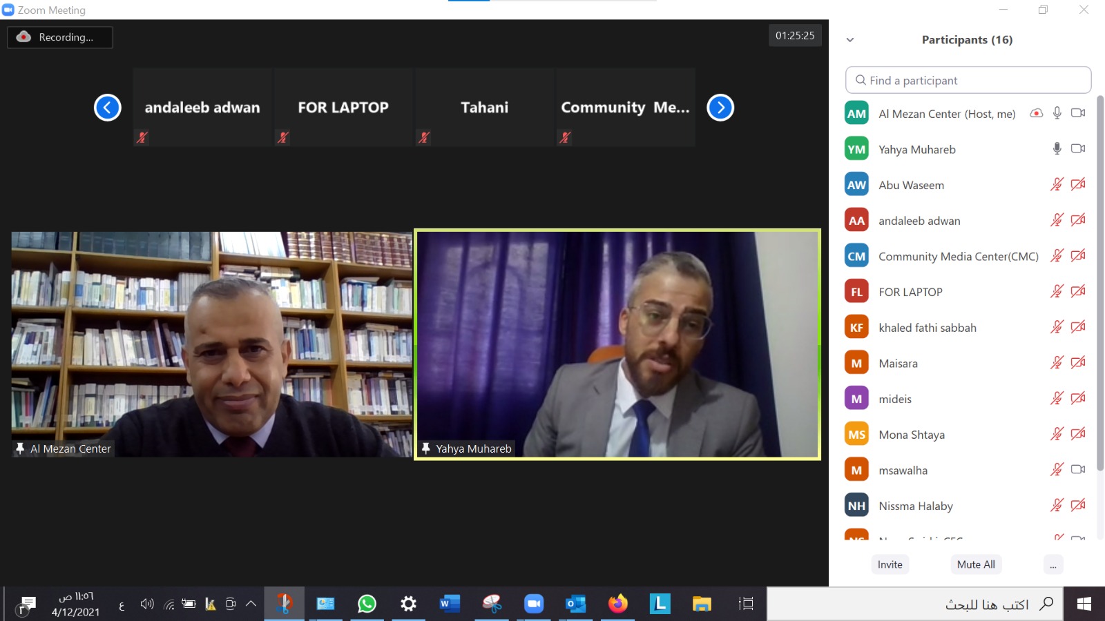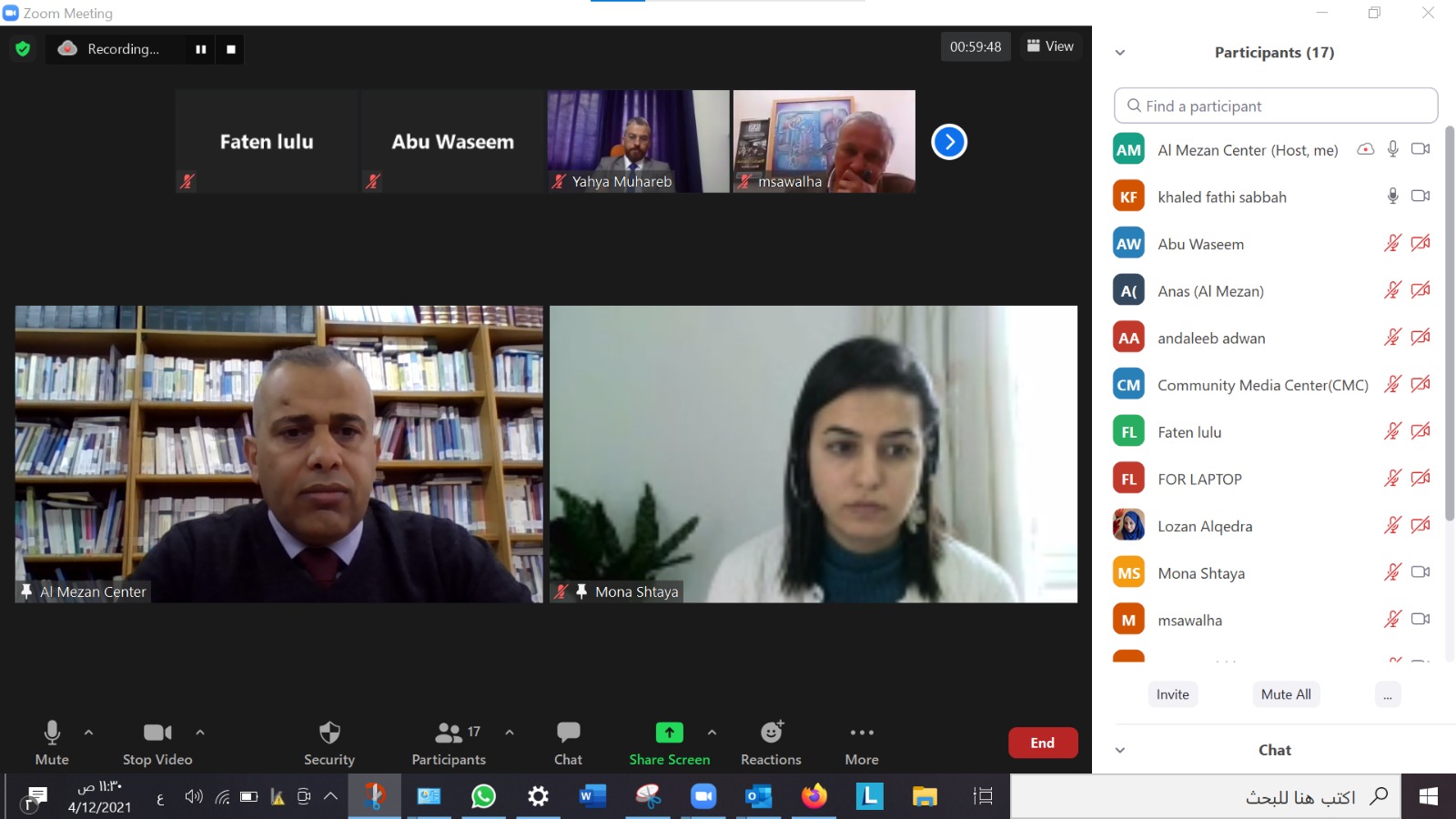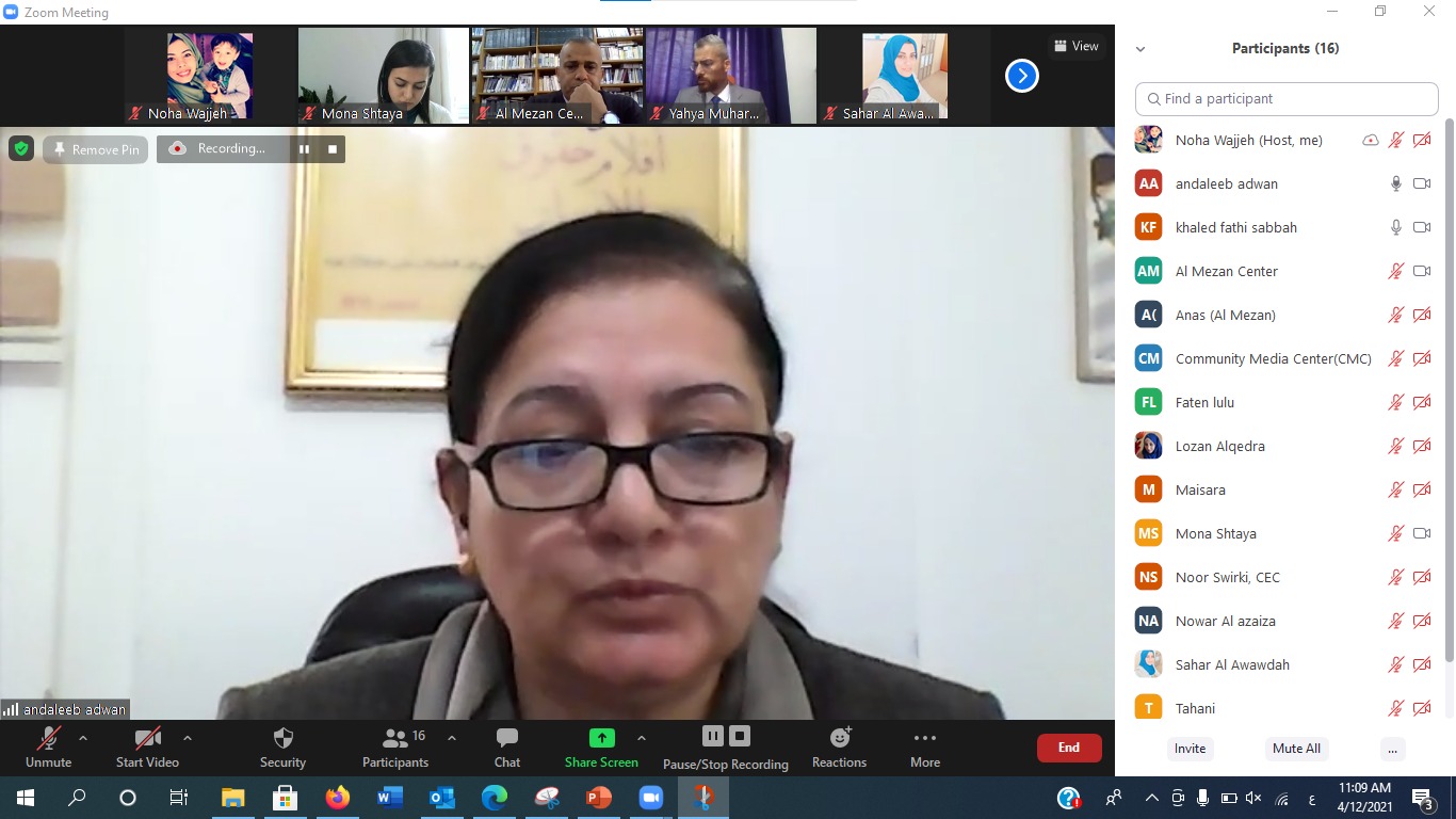 نظم مركز الميزان لحقوق الإنسان، اليوم الإثنين الموافق 12/ 4/2021م، ورشة عمل بعنوان " دور الإعلام في تعزيز نزاهة وحرية الانتخابات " عبر تطبيق زووم (zoom).