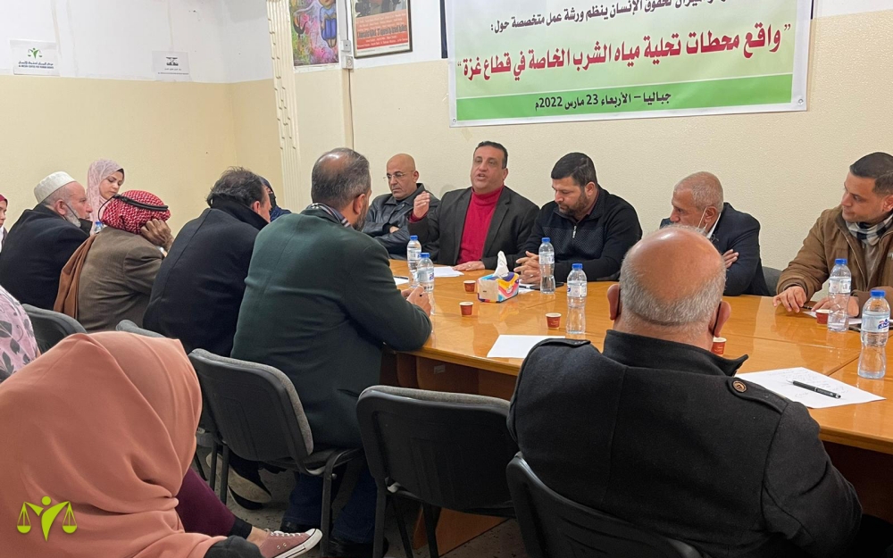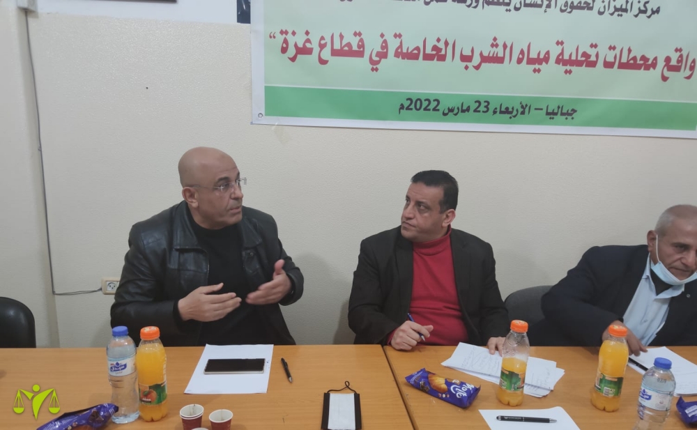 نظّم مركز الميزان لحقوق الإنسان، في مكتبه بمخيم جباليا، عند حوالي الساعة 11:00 من صباح يوم الأربعاء الموافق 23/3/2022م، ورشة عمل متخصصة حول: واقع محطات مياه الشرب الخاصّة في قطاع غزة وانعكاساته على حقوق الإنسان، وذلك في سياق احتفاله باليوم العالمي للمياه، بمشاركة (24) من أصحاب محطات التحلية والمهتمين وممثلي المؤسسات الأهلية.