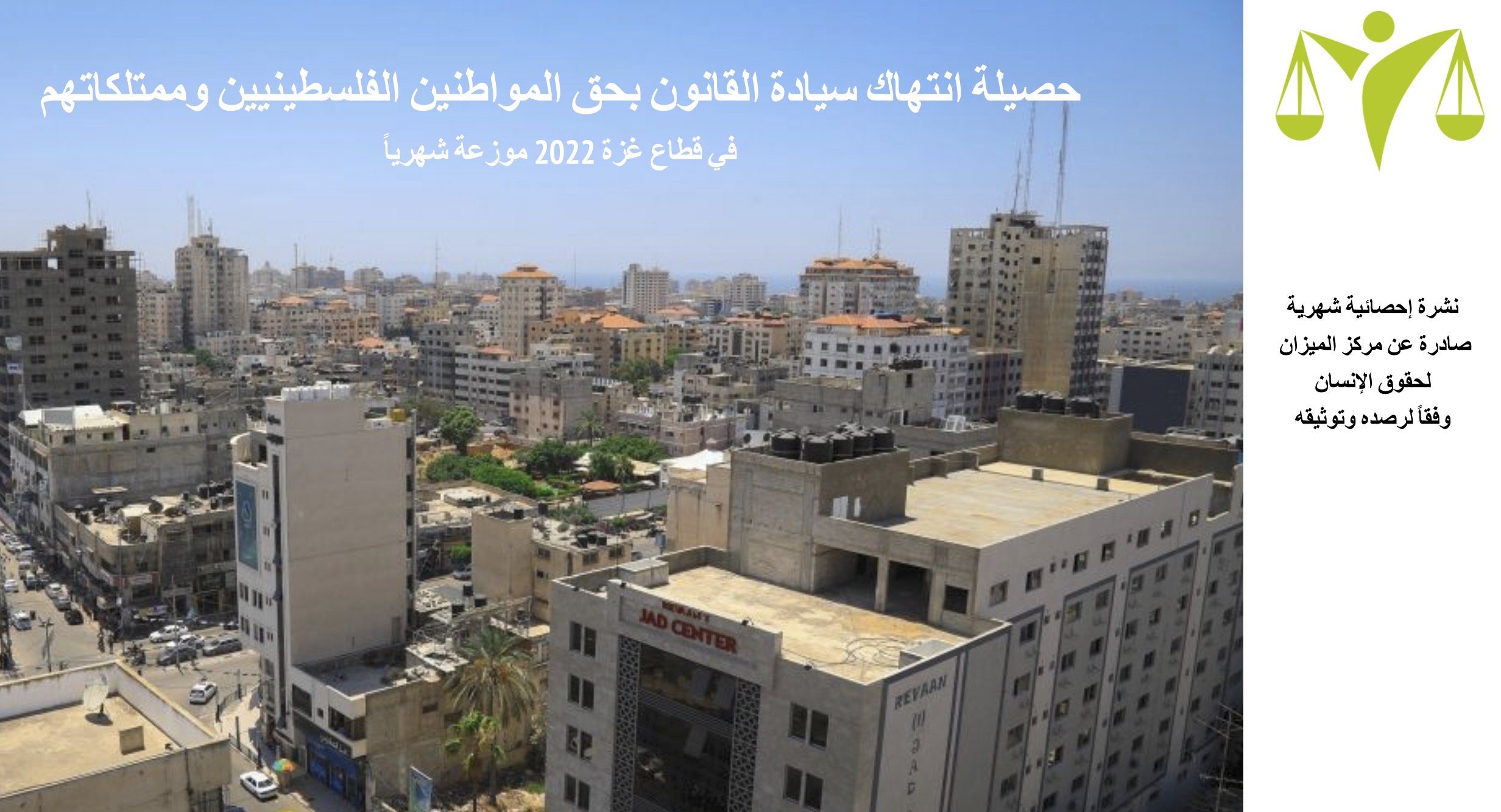 حصيلة انتهاكات سيادة القانون بحق المواطنين الفلسطينيين وممتلكاتهم في قطاع غزة 2022 موزعة شهرياً