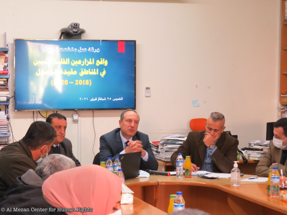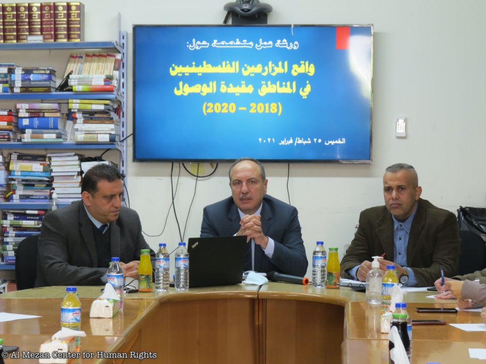 نظم مركز الميزان لحقوق الإنسان، في مقره بمدينة غزة، يوم الخميس الموافق 25/02/2021م، ورشة عمل متخصصة حول: واقع المزارعين الفلسطينيين في المناطق مقيدة الوصول، بمشاركة ممثلين عن وزارة الزراعة ومؤسسات دولية ومؤسسات المجتمع المدني الناشطة في مجال الزراعة والتنمية في قطاع غزة.