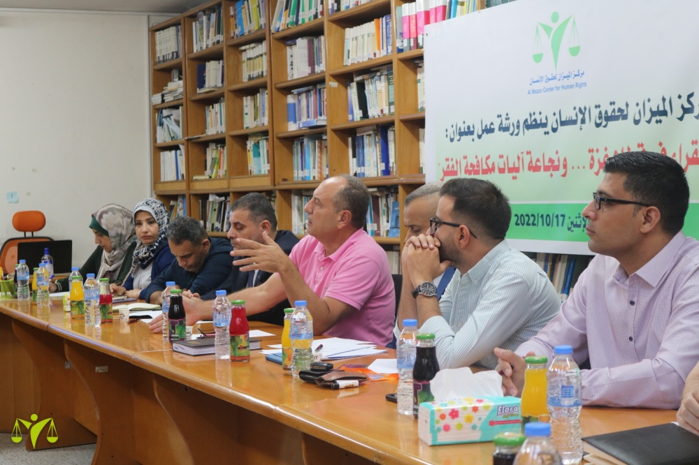نظم مركز الميزان لحقوق الإنسان اليوم الإثنين الموافق 17/10/2022، ورشة عمل بعنوان " الفقراء في قطاع غزة ... ونجاعة آليات مكافحة الفقر"، تزامناً مع اليوم الدولي للقضاء على الفقر، ممثلين عن وزارة التنمية الاجتماعية، والمؤسسات الدولية والحقوقية، ومؤسسات المجتمع المدني والنشطاء والمهتمين.