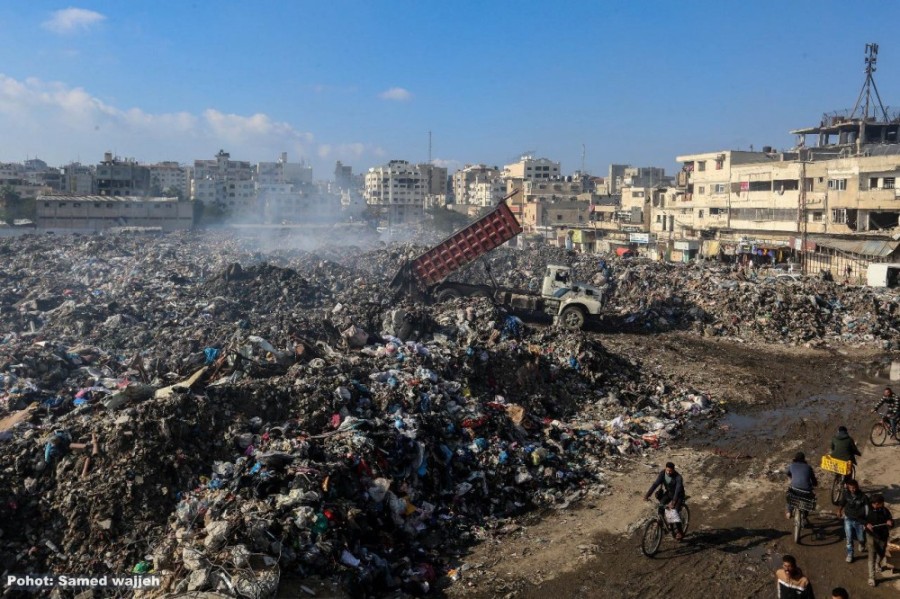 تواصل قوات الاحتلال الإسرائيلي استهداف البنية التحتية في قطاع غزة بشكل منظم ومتعمد، بما في ذلك المرافق الخدمية الحيوية التي لا غنى عنها وحياة السكان، كالمباني والمنشآت التابعة للبلديات، ومركبات وآليات جمع النفايات، وقد ساهم هذا التدمير الواسع في تفاقم أزمة النفايات الصلبة، وانتشرت أكوام القمامة وباتت تتكدس في الشوارع والأحياء السكنية، لاسيما في محيط أماكن تجمعات النازحين في مراكز الإيواء والخيام، حيث تنعدم وسائل جمع النفايات والتخلص منها أو معالجتها بصورة آمنة، ما يهدد بانتشار الأوبئة والأمراض المعدية نتيجة التلوث وتكاثر الحشرات والقوارض في تلك المناطق المكتظة بالسكان، ويتهدد حياة مئات آلاف الأسر بصورة مباشرة التي تعاني أوضاعاً معيشية سيئة، خاصة في فصل الصيف الحالي.