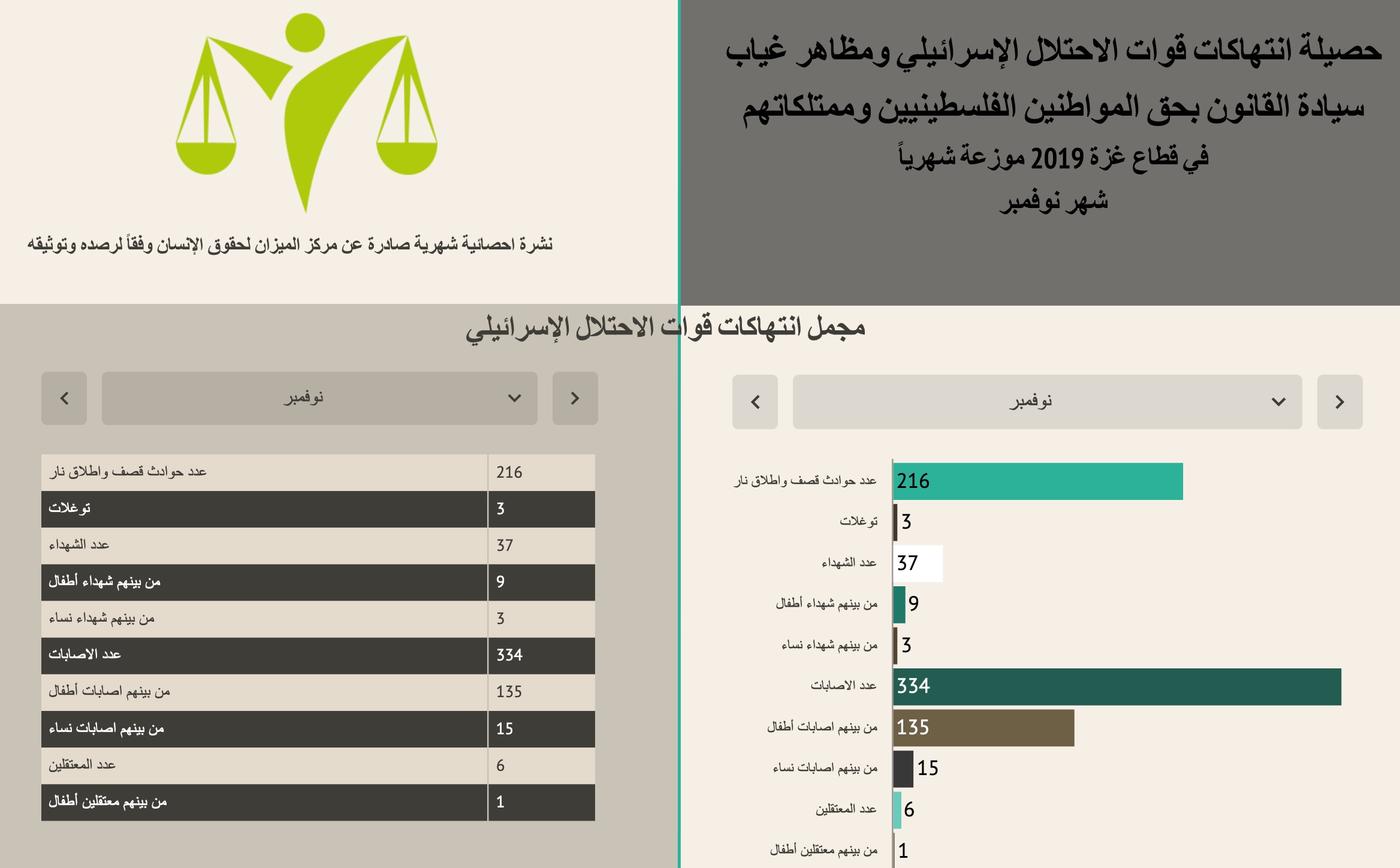 تشكل الأرقام والاحصاءات المنشورة في هذه الزاوية حصيلة أعمال الرصد والتوثيق التي تواصلها وحدة البحث الميداني في مركز الميزان لحقوق الإنسان، وهي حصيلة لعمليات جمع معلومات ميدانية يجري تدقيقها وعادة ما تستقى من الضحايا وشهود العيان وتدقق مع الجهات ذات العلاقة قبل أن تعتمد وتدخل إلى قواعد بيانات المركز. تظهر الإحصاءات التي يوردها مركز الميزان لحقوق الإنسان في هذه الزاوية الضحايا والأضرار المادية التي لحقت بالسكان المدنيين وممتلكاتهم وبالمنشآت والمرافق العامة جراء الانتهاكات الإسرائيلية المتواصلة بحق المدنيين من سكان قطاع غزة (بيئة عمل مركز الميزان). كما تظهر الإحصاءات ضحايا العنف الداخلي ومظاهر الانفلات الأمني، وكما هو معلوم فإن عمليات جمع المعلومات التي يواصلها المركز لم تعد تقتصر على حالة حقوق الإنسان وانتهاكاتها بل توسعت على مدى السنوات المنصرمة لترصد كل حالات الوفاة غير الطبيعية بما في ذلك ضحايا الأنفاق وسوء استخدام السلاح، وكل الحالات التي يجري فيها أخذ القانون باليد. ويهدف مركز الميزان من وراء نشر المعلومات الإحصائية إلى مساعدة المهتمين في الحصول على مؤشرات حول حالة حقوق الإنسان، وفيما يتعلق بالأحداث الداخلية كأحداث العنف وأخذ القانون باليد فيهدف الميزان من وراء جمع المعلومات حولها إلى تنبيه صانعي القرار وقوى المجتمع الحية إلى واقع سيادة القانون، لأن أخذ القانون باليد واحد من المؤشرات المهمة على تدهور سيادة القانون. كما يقدم المركز معلومات وافية حول الانتهاكات الإسرائيلية وضحاياها لفضح الانتهاكات الإسرائيلية المستمرة والتي تتركز في الآونة الأخيرة في المناطق مقيدة الوصول في البر والبحر واستمرار القيود المفروضة على حرية الحركة والتنقل واستخدام الاعتقال التعسفي وعمليات الابتزاز بحق من يحاولون السفر عبر معبر بيت حانون. |